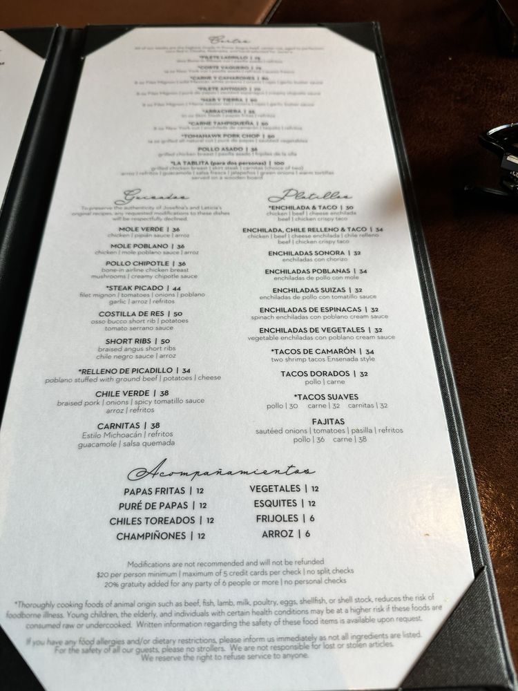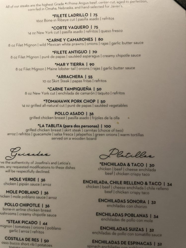 Grilled aged USDA Prime Center cut 6 oz. New York steak topped with strips of chiles and onions. Served with a mole chicken enchilada, taquito, refritos and guacamole.